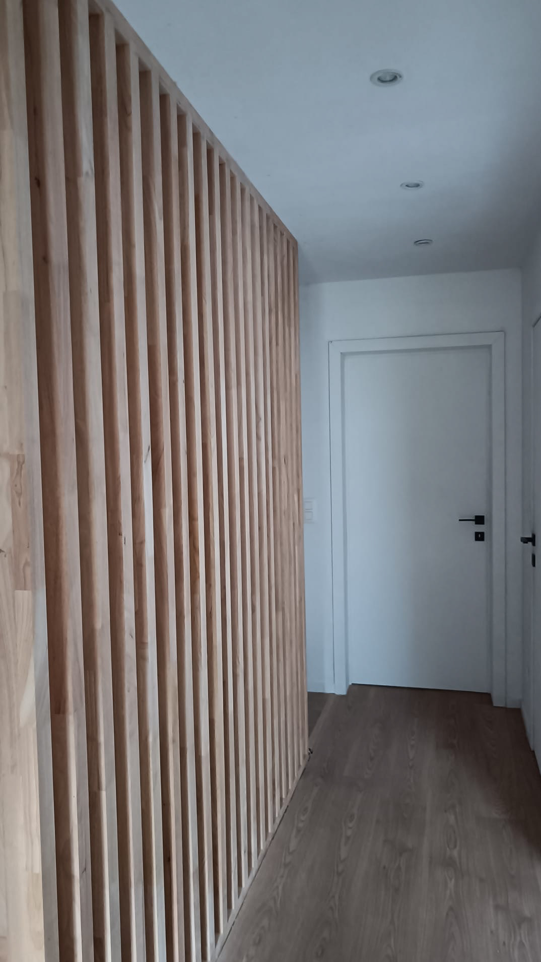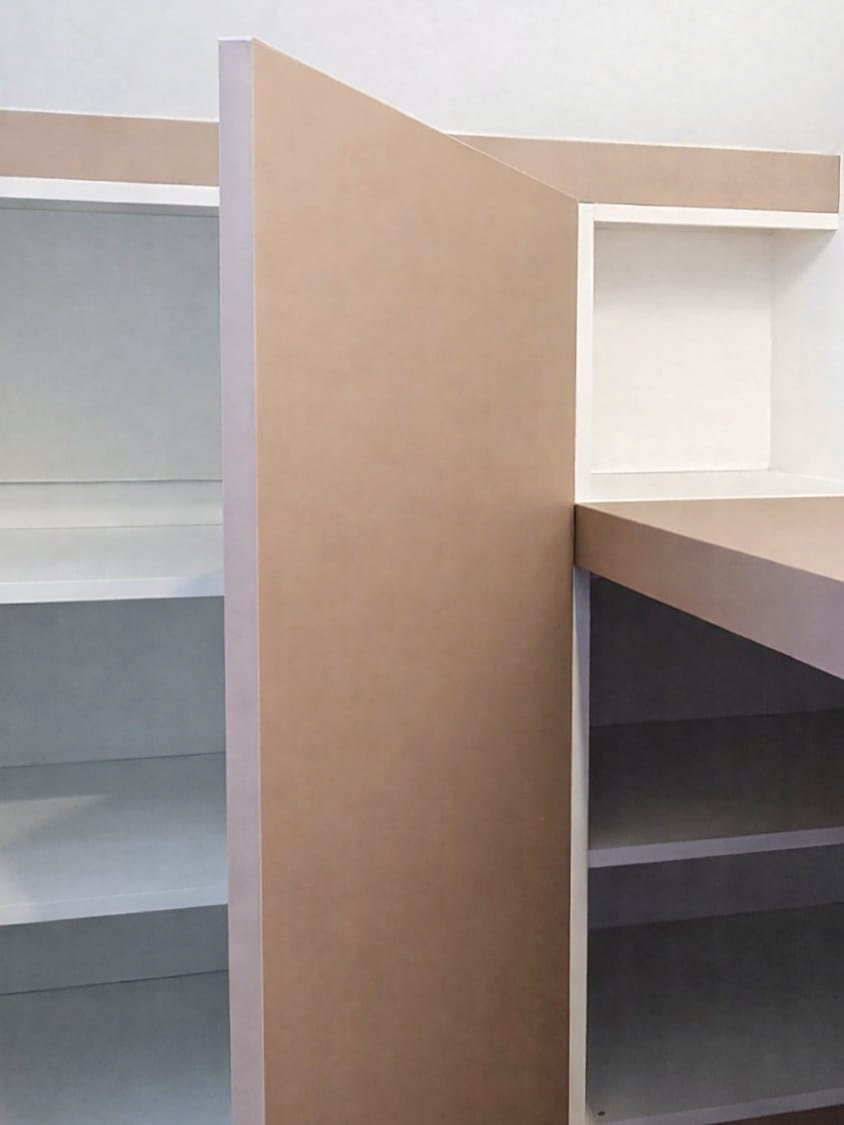 Maatkasten in witte melamine met meranti blad en leggers